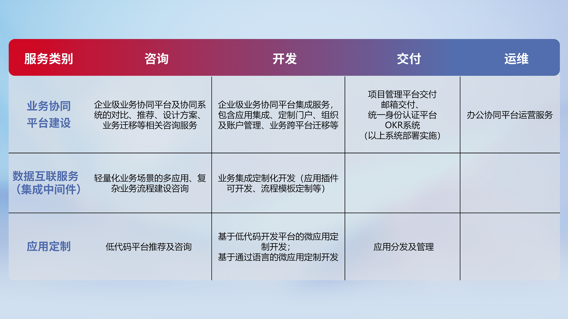 针对钉钉、、企微、、、IDaas等平台级产品提供产品的规划、、、方案、、、、交付、、定制化开发等服务,,实现如统一协同办公、、、、智能客户服务、、混合会议管理、、、、智能数据查询、、等业务场景,,,,实现数字化转型。。。